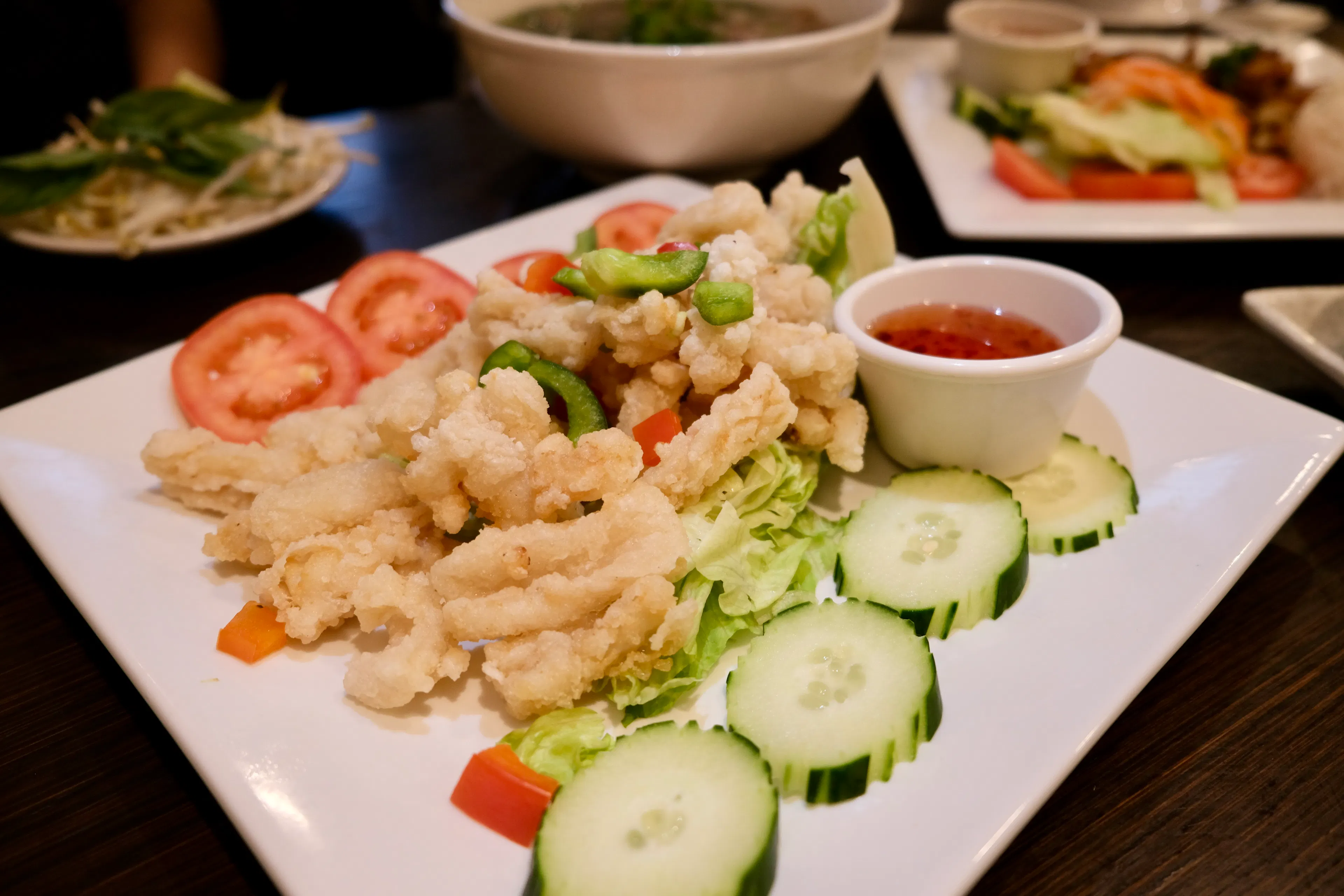 Our first main dish was the crispy squid, which our server told us is a customer favorite, and was the collective standout of the night. This dish features squid coated in tapioca starch and deep-fried, then served with a sweet chili sauce. Although we would have liked a greater ratio of squid to fried batter, the batter was light and very crispy, pairing perfectly with the sticky sauce. The accompanying cucumbers and tomatoes felt somewhat mismatched and haphazardly arranged. However, that did not detract from the squid’s starring role, making it easy to overlook. Indeed, our server’s recommendation was spot on. Our only qualm was that we would have liked a greater ratio of squid to fried batter.