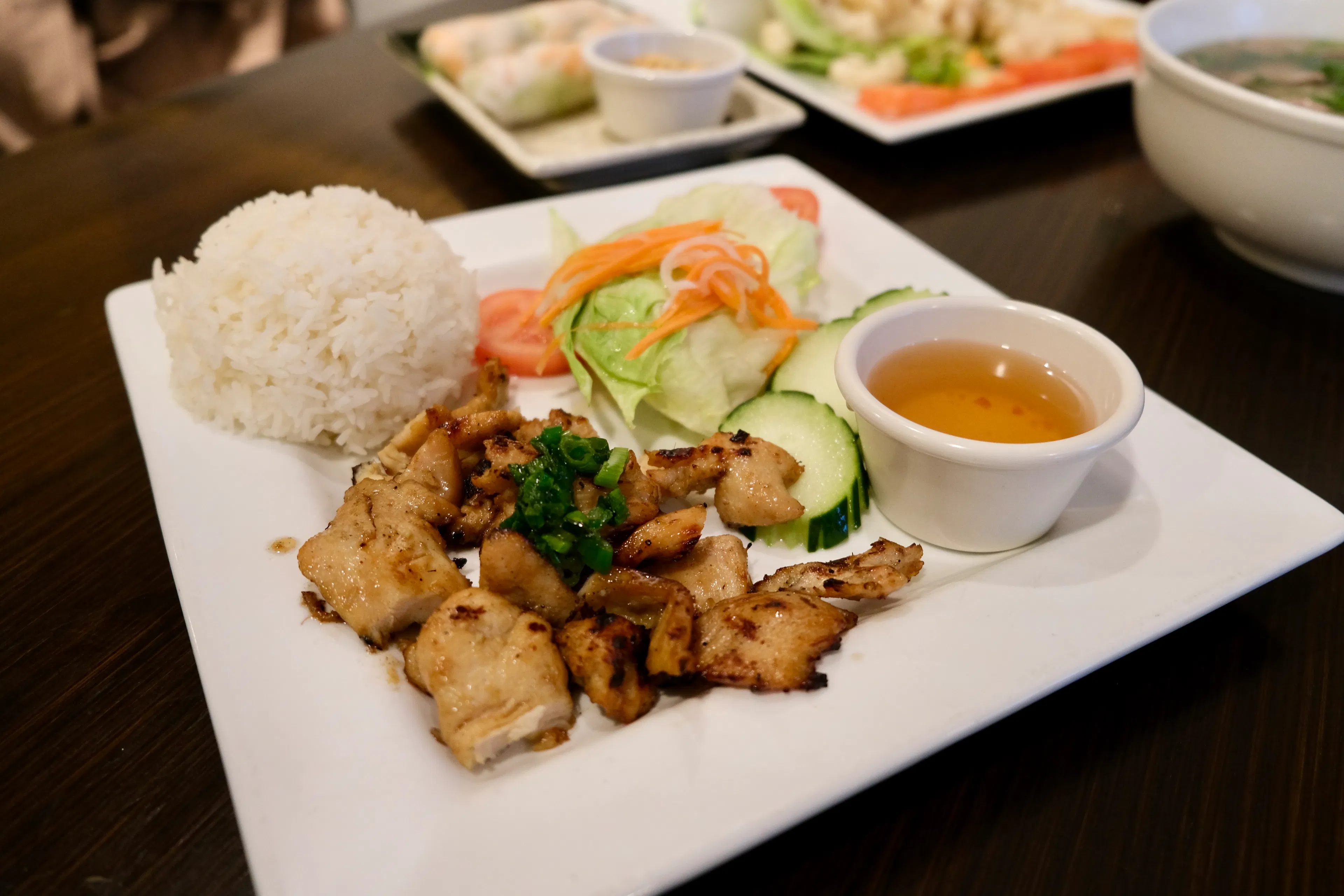 We set out to sample a wide variety of meats and dishes during our visit. To that end, we recommend trying any of the selections we ordered, with the exception of the grilled chicken plate, which unfortunately did not meet our expectations that evening. Overall, the food was decent and offered a satisfying range of flavors. However, the true standouts were the sauces – especially the sweet chili and hoisin peanut sauce. These condiments significantly elevated every dish they accompanied, adding a delicious complexity that complimented the main ingredients.